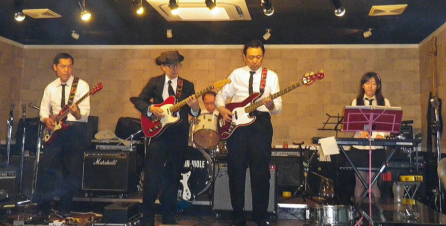| 満る登(うどん屋)でエレキ好きが沢山集まり、いろいろメンバーが 代わりながら出来ました、現在のダックスです。リーダーの福田さん 、全部機材を揃え、岐阜、愛知等、あっち、こっちで活動してますの で、見かけたら、ぜひ、応援してください。 ベンチャーズナンバーを主にレパートリーは30曲以上、このバンドの すごいところは、譜面無しで演奏するところです、かっこいい! いいサウンドを出してます、テレキャスを弾いてますます輝いて来た米山さん、帽子を取ると、もっと輝くかも、、、。 左から、SGuitar 五藤さん Guitar 米山さん Drums 福田さん(リーダー BassG 金山さん Key アンジュ |